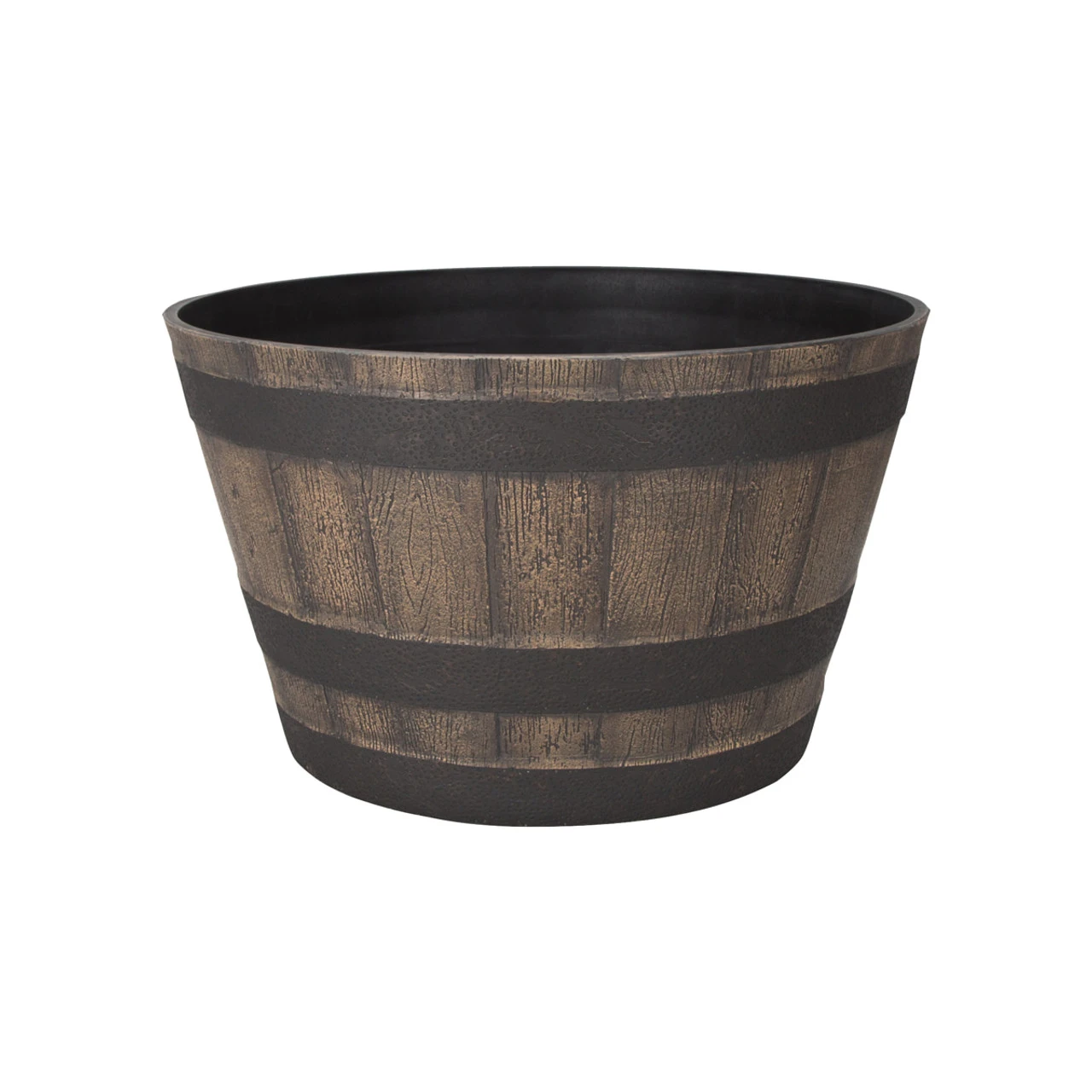 Classic whiskey barrel planter is lightweight and construction of durable high density resin that withstands frost in the winter. UV coated finish protects color from fading.