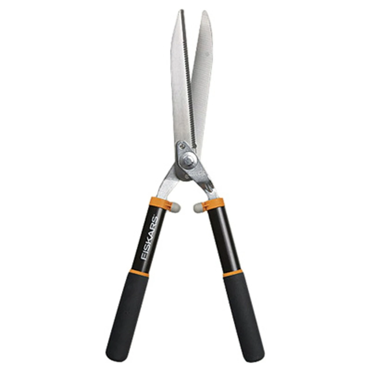 Fiskars Power-Lever Hedge Shears feature compound lever technology that multiplies your leverage to give you up to two times more cutting power than traditional single-pivot shears. Fully hardened, precision-ground steel blades feature a serrated edge to grip while cutting, and a patented self-sharpening design ensures that every cut is clean and crisp. A rust-resistant, low-friction coating makes every cut even easier, shock-absorbing bumpers absorb jarring vibrations, and durable steel handles with non-slip grips offer control.