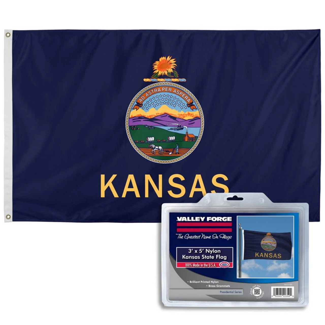 This 3 x 5 ft. state flag is made of heavy-duty, close-weave printed Perma-nyl nylon. The sturdy nylon construction allows the flag to be able to withstand wet and windy conditions yet is also lightweight enough to fly in the slightest breeze. Nylon dries quickly and it will not wear, tear or fade as easily as cotton. This flag has been tested for its strength, durability, lasting color, and fly ability. Valley Forge stands behind its promise to ensure domestically made FMAA certified products. Always look for the seal of domestic guarantee on your flag. This flag measures three feet by five feet, making it ideal for a six-foot residential flag pole. This flag features extra heavy, white polyester canvas heading.